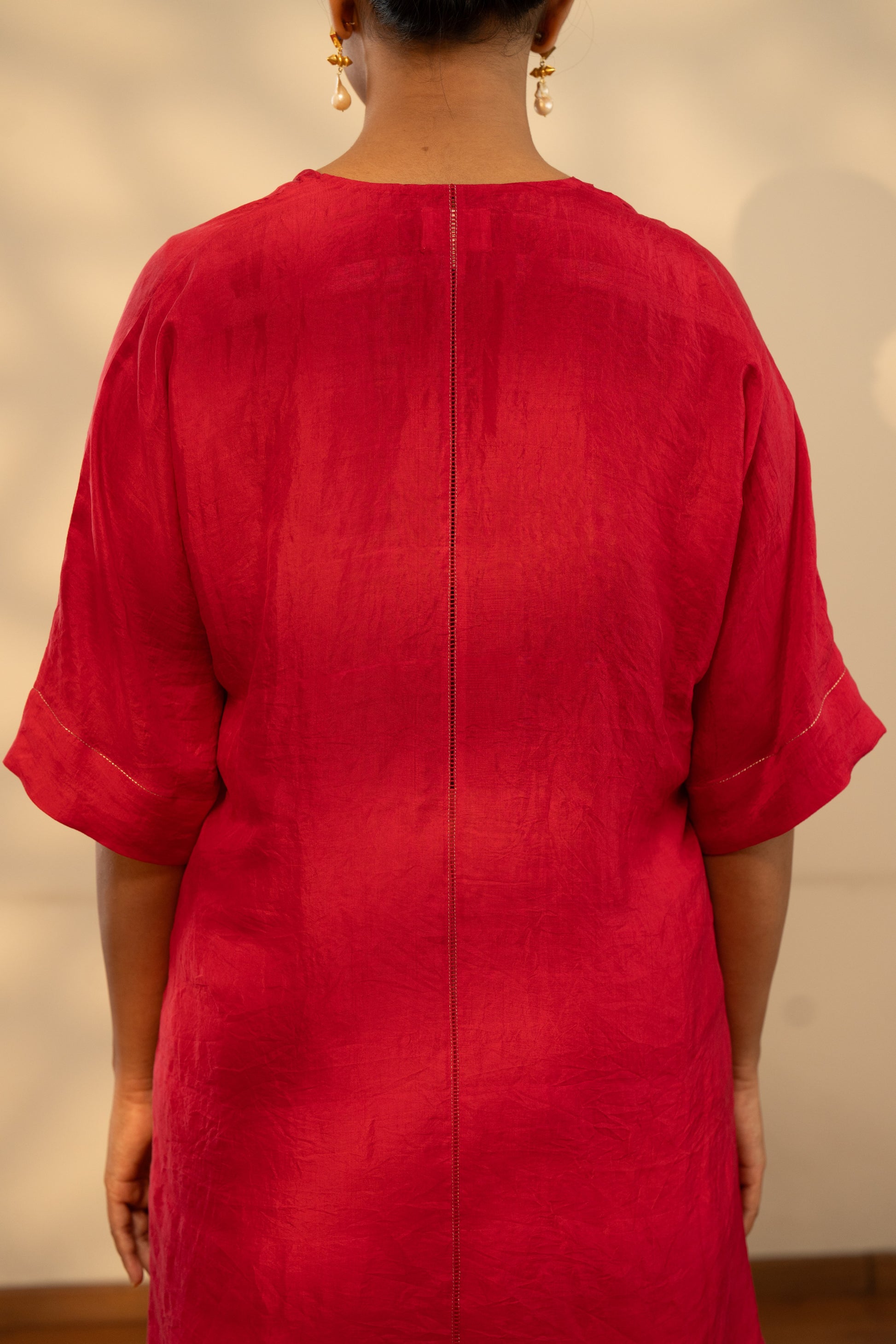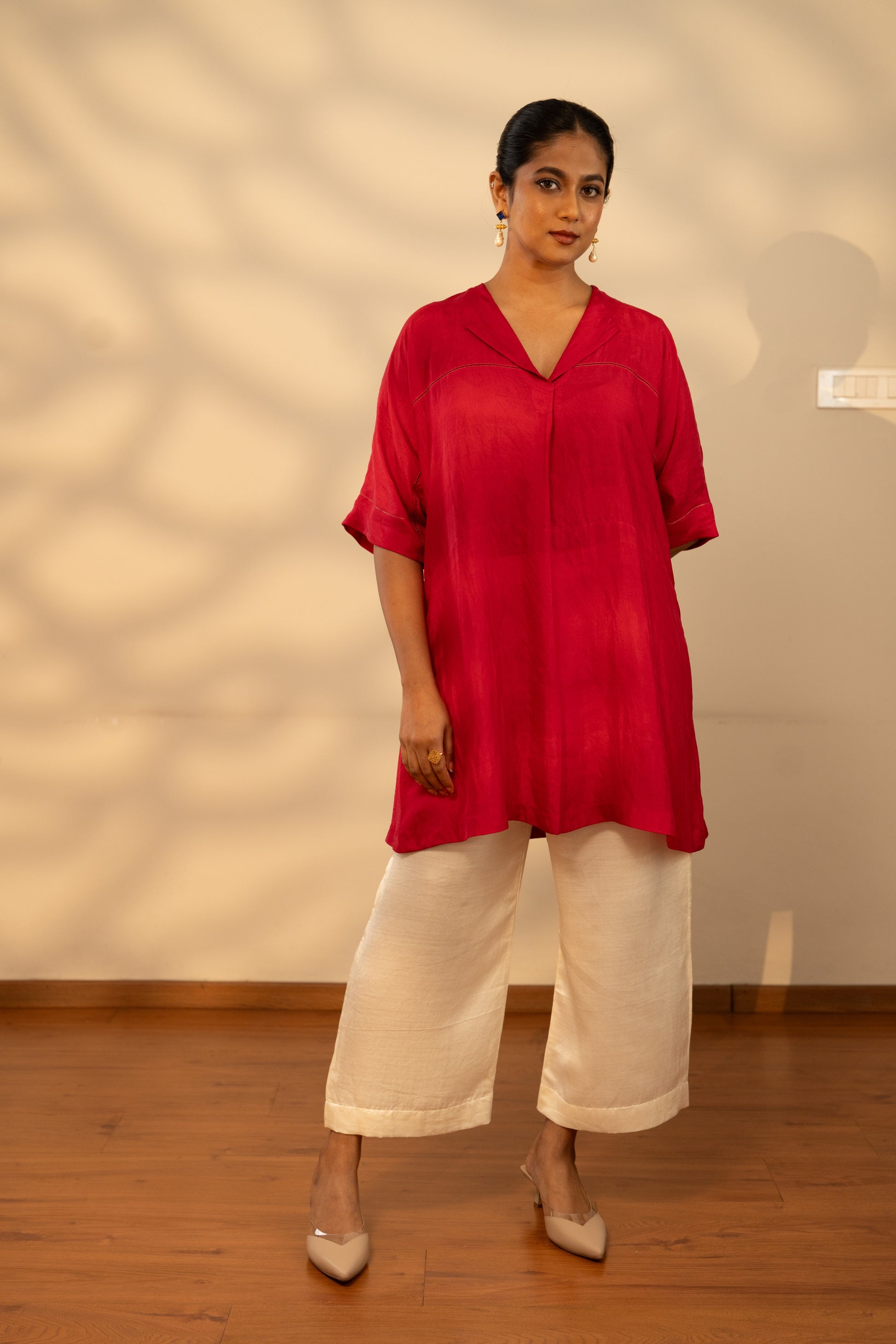 This versatile piece, styled as a short kurti or dress, features a V-neckline with a delicate notch detail, elbow-length sleeves, and a comfort-fit silhouette that drapes effortlessly.